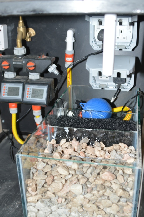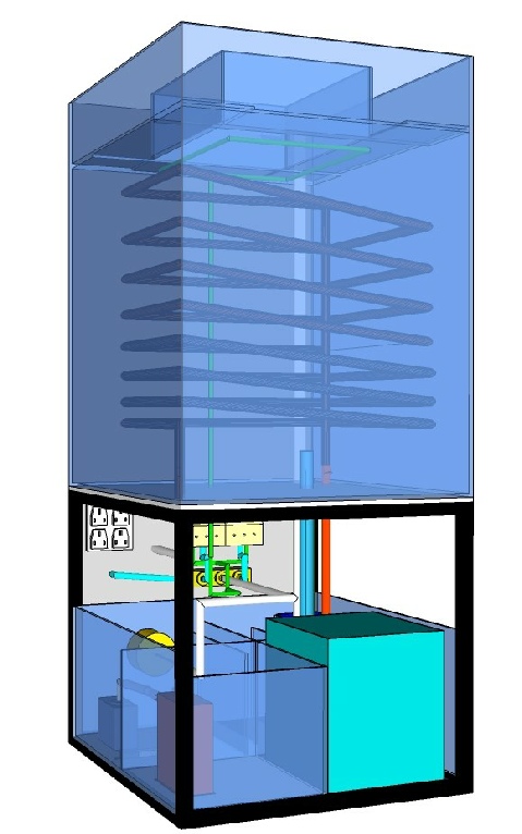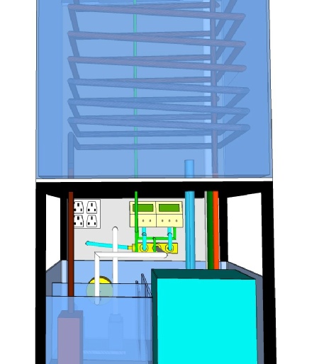 Our original concept for this new design showed a steel framed base containing various equipment with pipes and wires going through the bottom of the tank into a soil filled nest tank above.The overall unit was designed to be around 1500mm high, with around 500mm allowed for the base. Within this equipment cupboard would be housed a filter to keep the water in the moat free from debris, the most common source of bridges across the water; a chiller and heating unit to cool down and heat up the nest, depending on requirements. Also two taps, plumbed into mains water, both connected to water computers, one to mist the surface with rain from above, and one to water the soil when the automatic soil probes indicated that the nest media was too dry. Within the nest tank there would be a long coil of flexible pipe